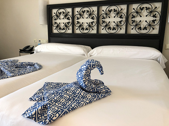 Ebenfalls in einzigartiger Lage präsentiert sich der Parador de Málaga: hoch über Stadt und Hafen auf dem Monte Gibralfaro, gegenüber der muslimischen Alcazaba. Mediterrane Vegetation, Naturstein und Holz schaffen eine gemütliche Atmosphäre, die Plätze auf der Loggia-Terrasse sind gefragt für den Aperitif. Ein kleiner Swimmingpool auf dem Dach des Hotels bietet wie die Restaurant-Terrasse stimmungsvolle Ausblicke auf Málaga. Unser Zimmermädchen Carmen überraschte uns jeden Tag mit einer kunstvollen Drappierung der Tagesdecke oder der Handtücher – ein überaus liebevolles Detail. Die Panoramalage des Hotels – man kann sogar einen Blick von oben auf die Stierkampfarena werfen – führt natürlich unzählige Touristen an diesen Ort, die sich nach 10 „Schau-Minuten“ verabschieden müssen, während wir mit einem Gin Tonic oder einem „tinto de verano“ den Ausblick den ganzen Abend genießen können.